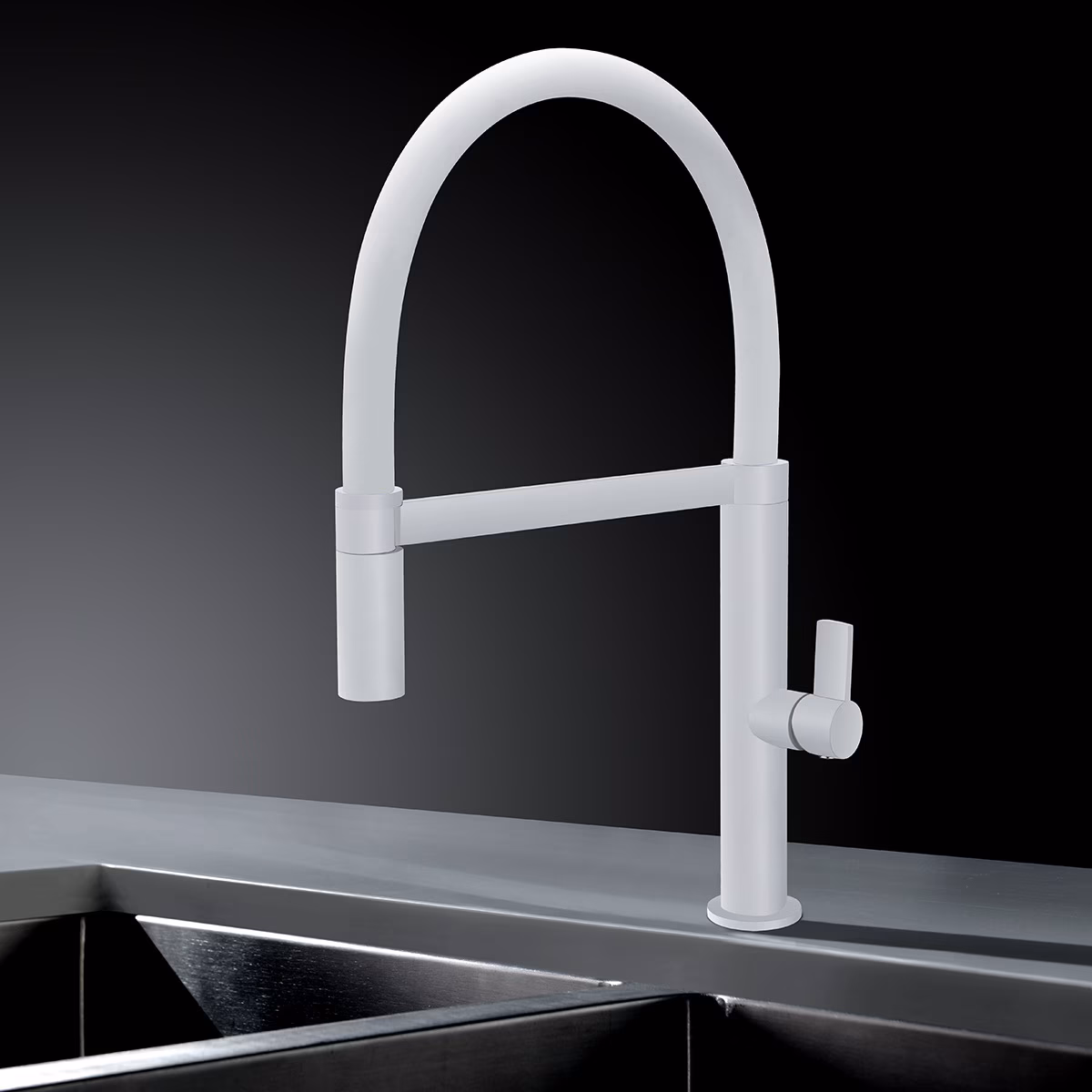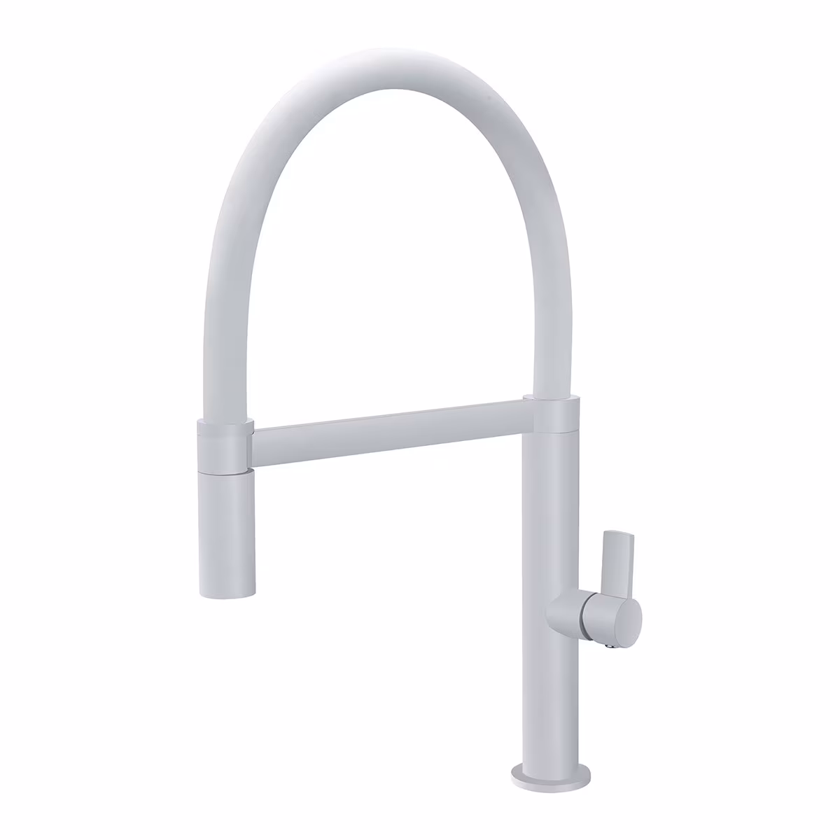 Grifo cocina flexible blanco mate LAOS de Imex es un monomando de cocina fabricado en latón, acabado lacado blanco mate.