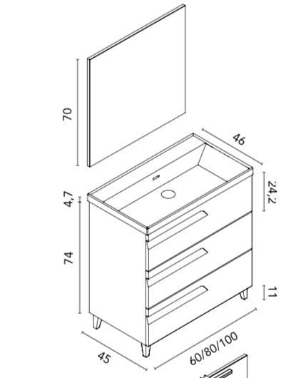 Tiene 3 medidas de ancho: 60, 80 o 100 cm, 46 de cm de fondo y 78,7 cm de alto.