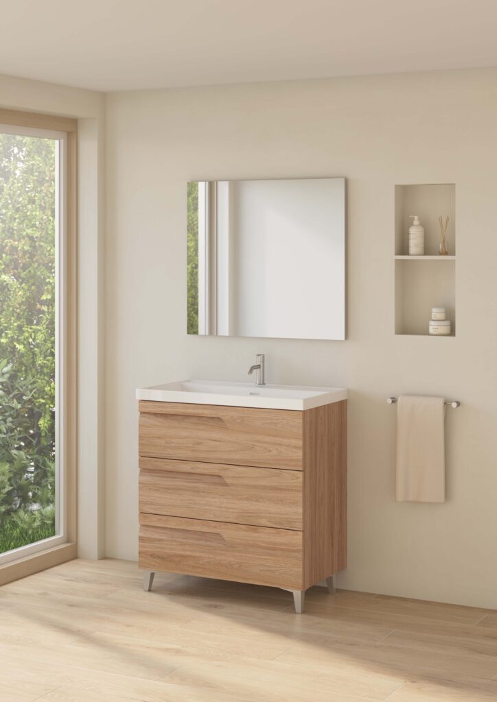 Conjunto mueble de baño 3 C VITALE y lavabo Cairo de Royo es parte de una colección que  refleja el dinamismo y la vitalidad de quienes llevan una vida activa y sin pausas.