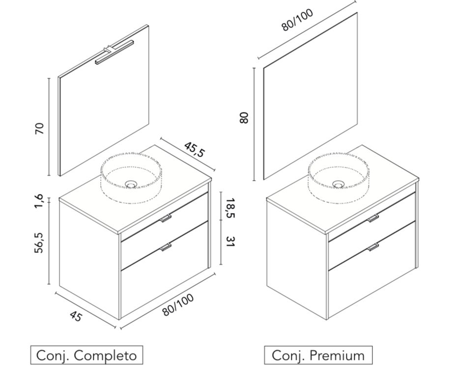 Se presenta como un conjunto de mueble de baño moderno de 2 cajones compuesto por el mueble y la encimera del mismo acabado o (si lo prefieres) puedes elegirlo con el espejo Murano .