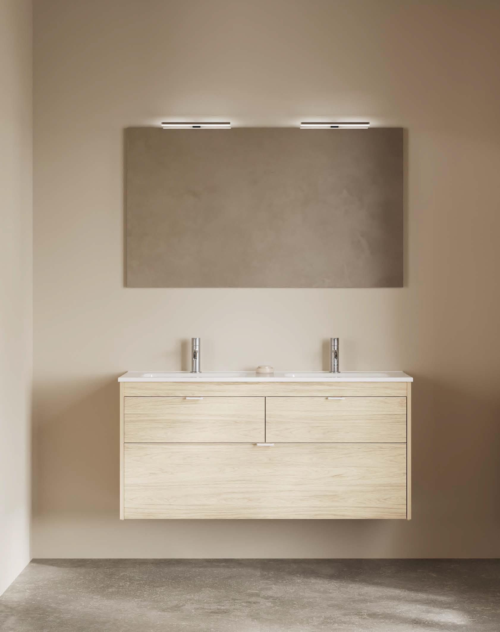 Opcional se puede elegir el conjunto premium compuesto por el mueble, el lavabo Enzo y el espejo con luz Blaze.