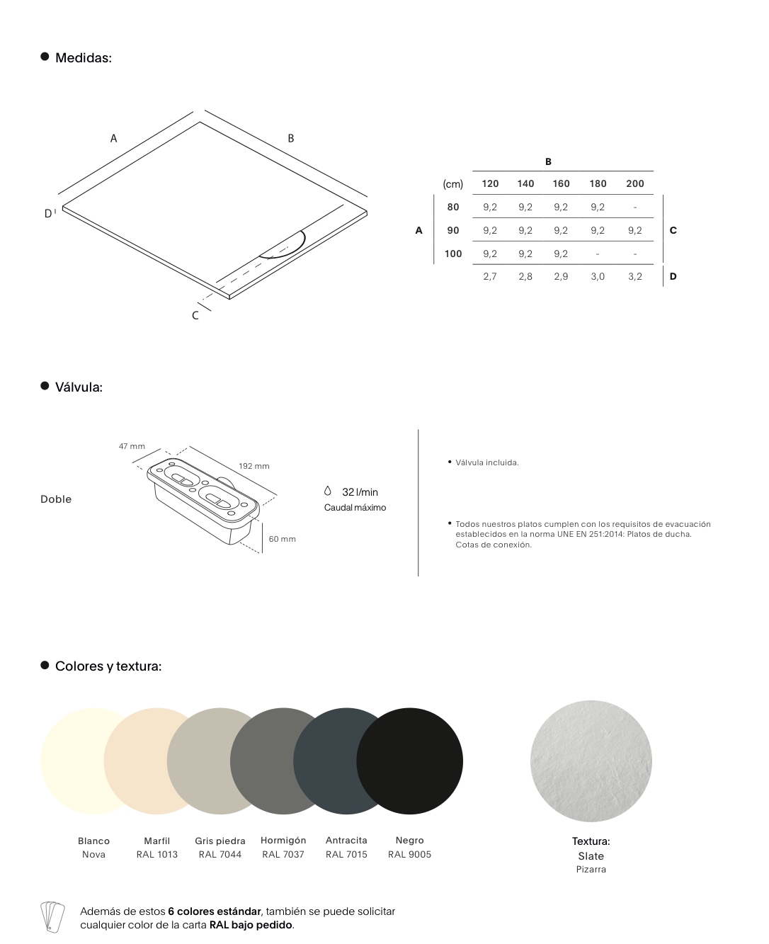 Colores estándar: Blanco, Gris piedra, Hormigón, Marfil, Antracita y Negro.